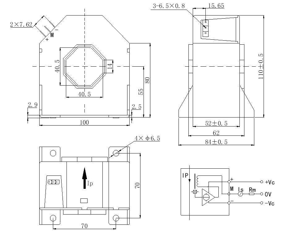 工作原理 | 工作電壓V | 額定電流IP/A | 輸出 | 精度% | 響應(yīng)時(shí)間 | 抗電強(qiáng)度kV | 工作溫度℃ | 備注 |